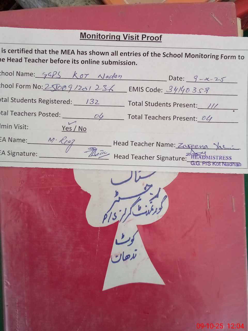 | Attendance Register | Head Teacher | MEA with School | Visit Proof |