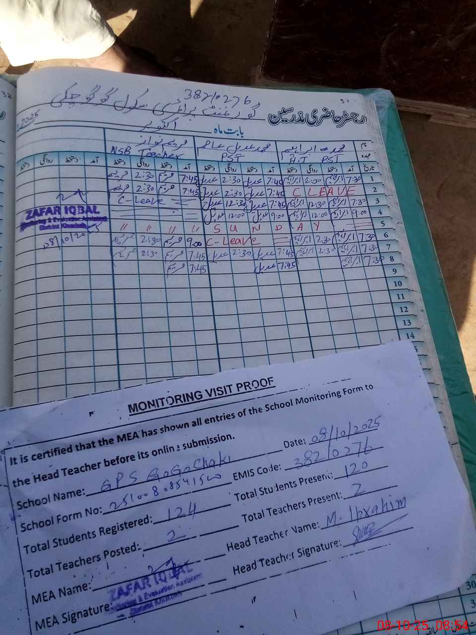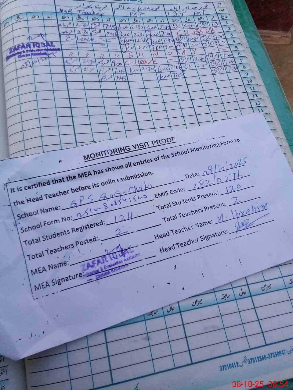 | Attendance Register | Head Teacher | MEA with School | Visit Proof |
