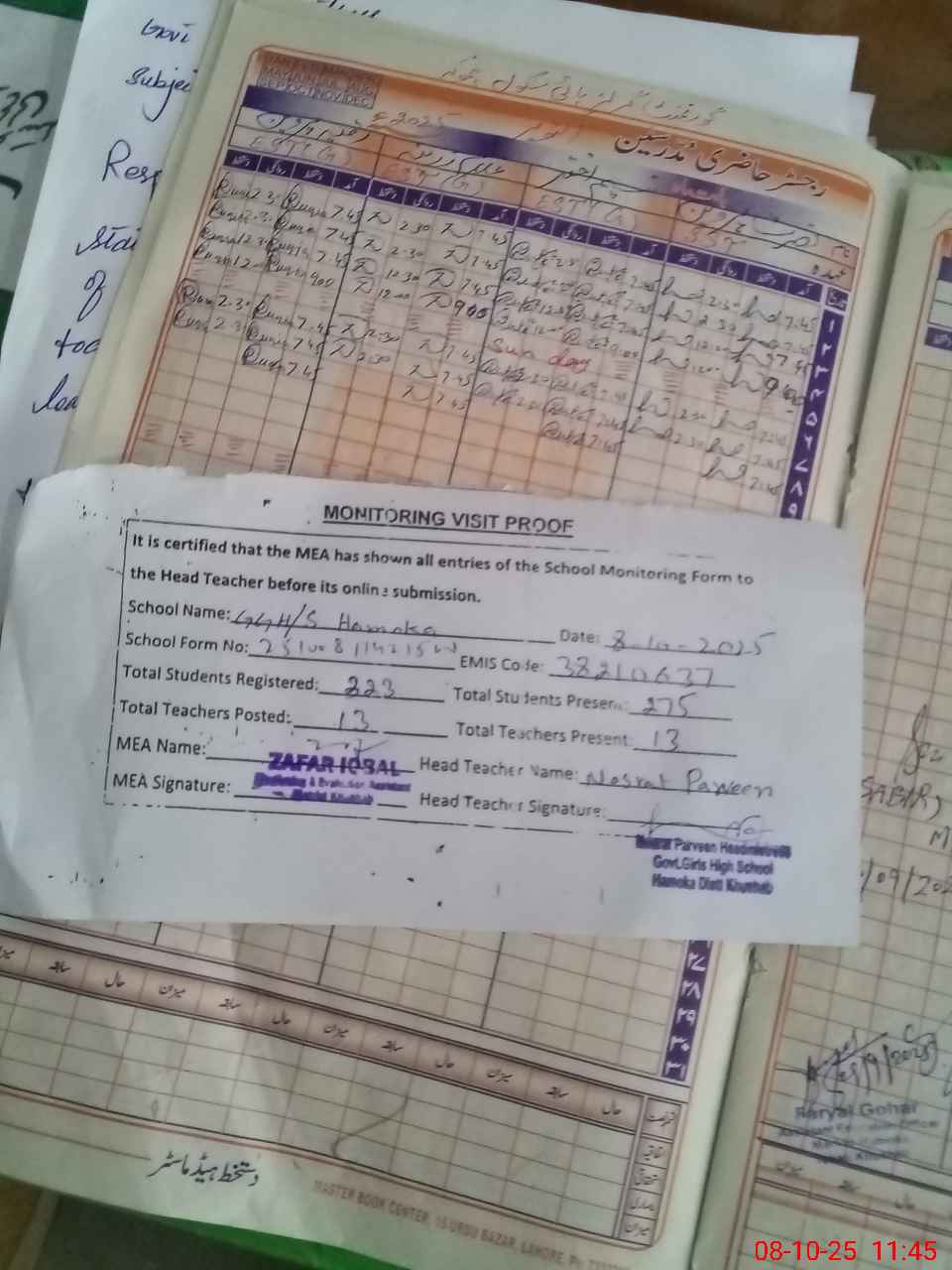 | Attendance Register | Head Teacher | MEA with School | Visit Proof |