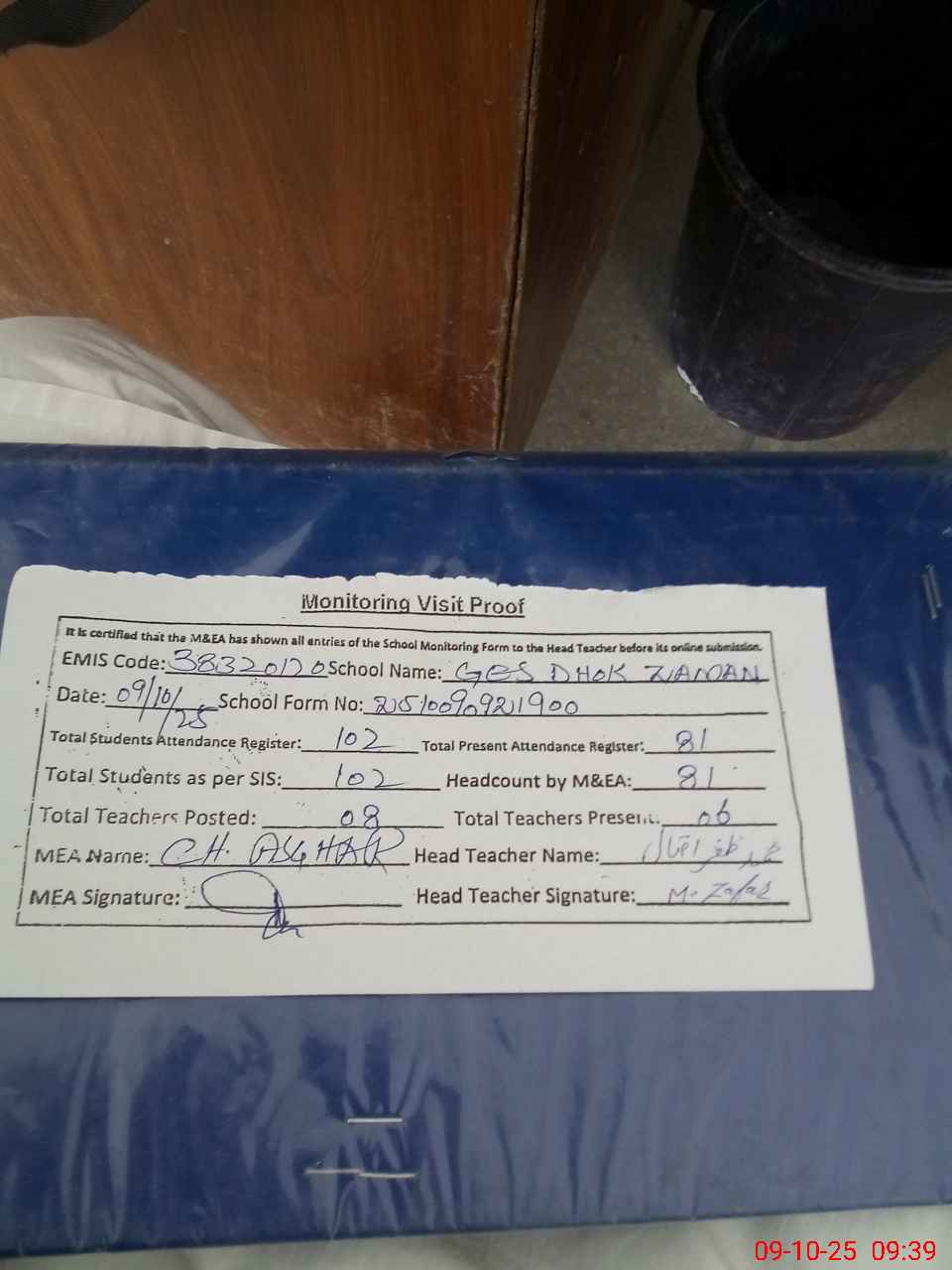 | Attendance Register | Head Teacher | MEA with School | Visit Proof |
