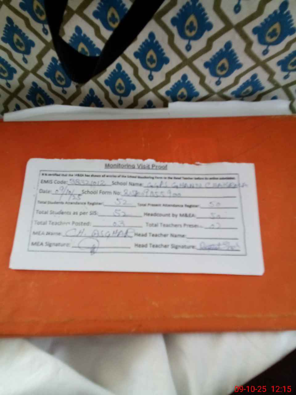 | Attendance Register | Head Teacher | MEA with School | Visit Proof |