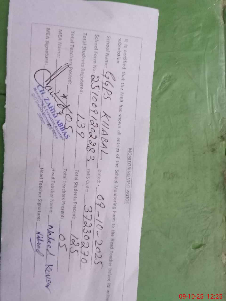 | Monitoring Date: 09-10-2025 | Start Time: 09-10-2025 12:02 PM | End Time: 09-10-2025 12:26 PM | Name of MEA: Za**** Ab**** | |