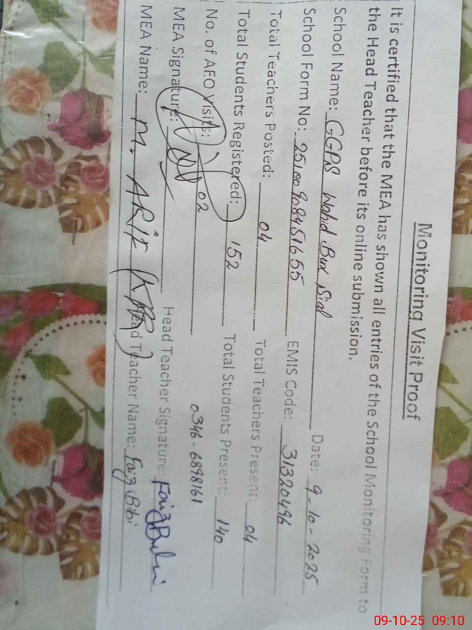 | Certified that this School was Inspected by the Undersigned MEA/DMO Today and the Information Stated Above is as Per Record. | |||||