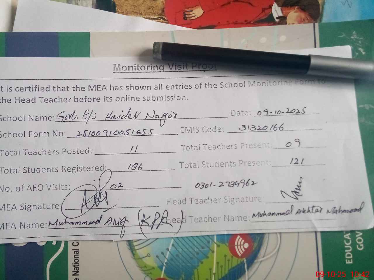 | Attendance Register | Head Teacher | MEA with School | Visit Proof |