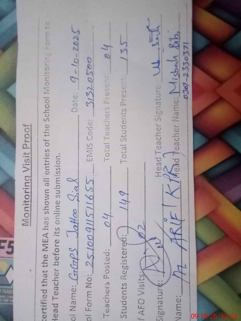 | Name: Mi**** Bi**** Designation: (School Headmaster's/Headmistress's) PST/PTC/JV Phone/Cell Number: 03**** |