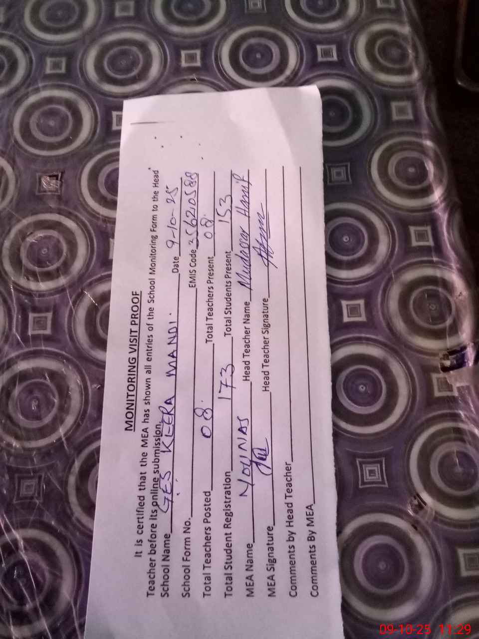 | Attendance Register | Head Teacher | MEA with School | Visit Proof |