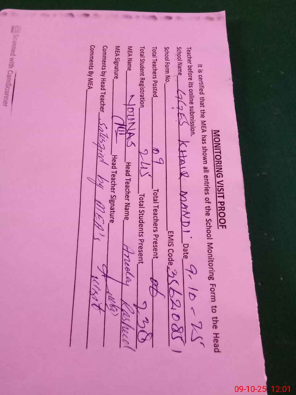 | Attendance Register | Head Teacher | MEA with School | Visit Proof |