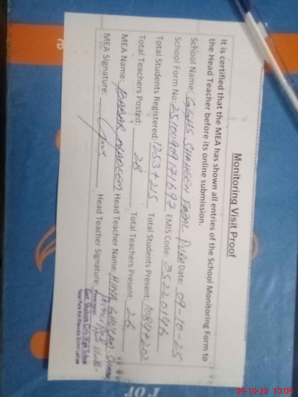 | Certified that this School was Inspected by the Undersigned MEA/DMO Today and the Information Stated Above is as Per Record. | |||||