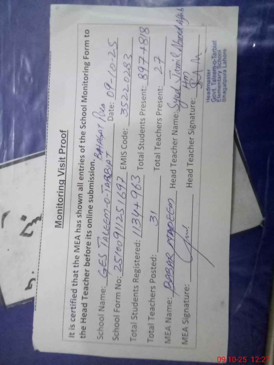 | Attendance Register | Head Teacher | MEA with School | Visit Proof |