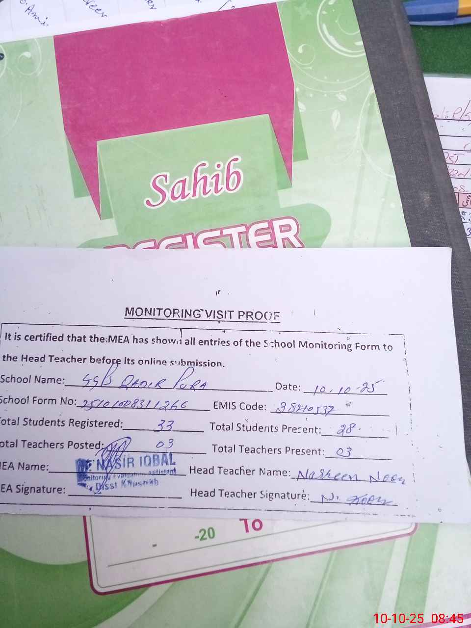 | EMIS Code: 38210537 | Name of School: GGPS QADIR PURA KHUSHAB | |||