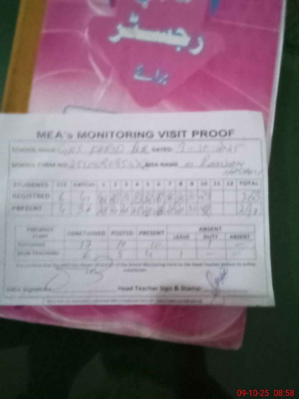 | Attendance Register | Head Teacher | MEA with School | Visit Proof |
