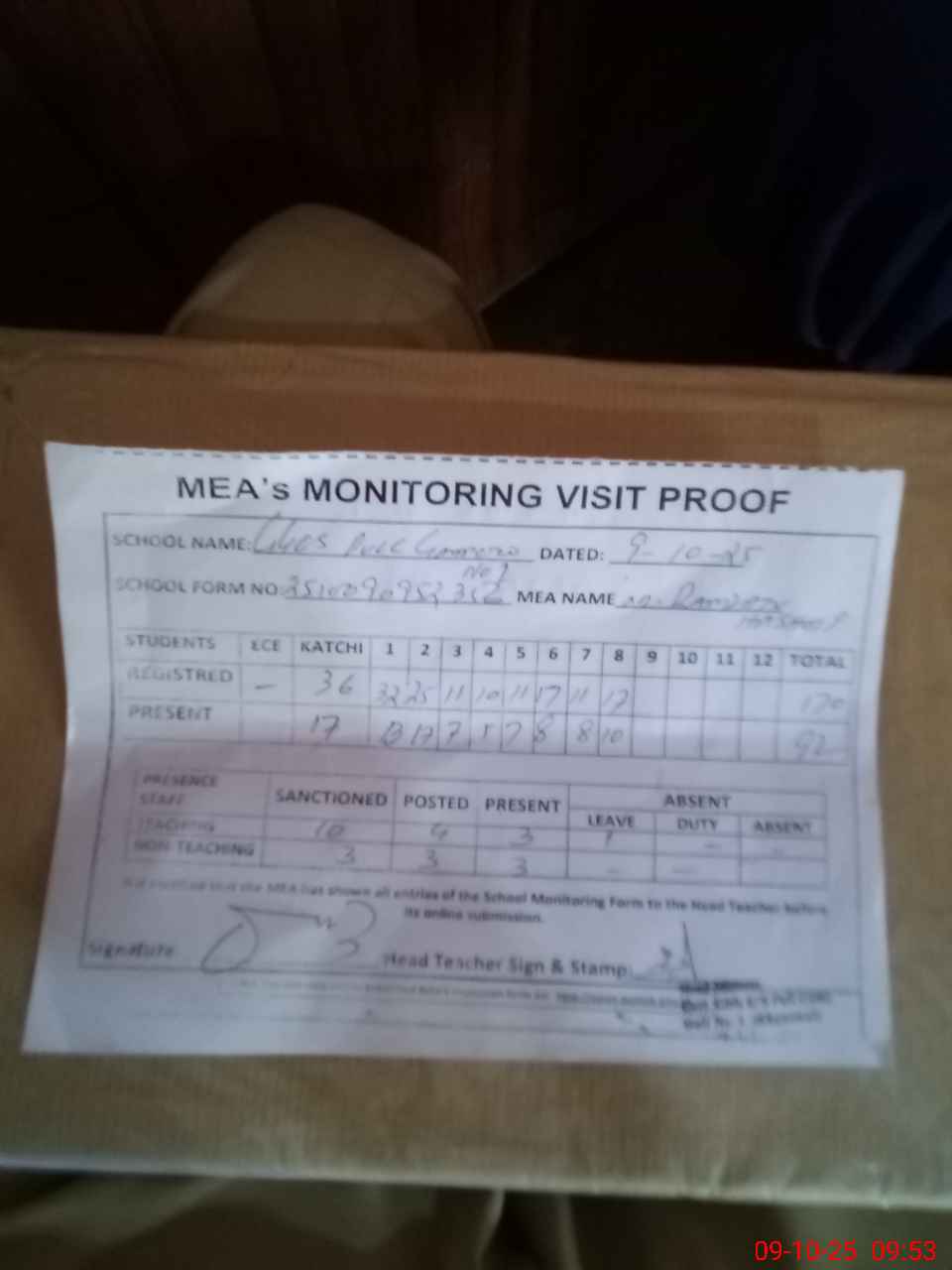 | Attendance Register | Head Teacher | MEA with School | Visit Proof |