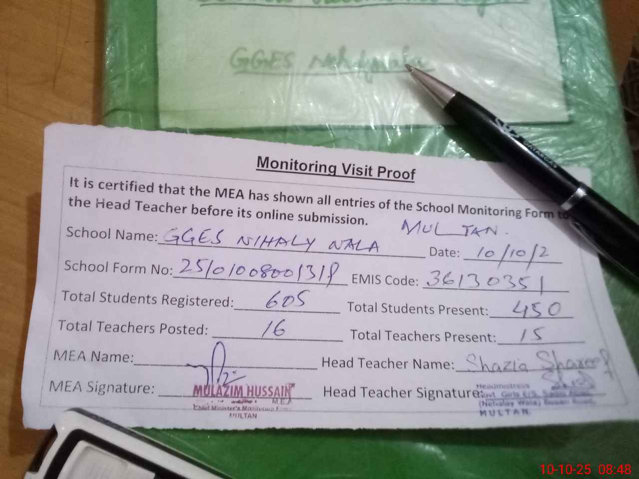 | Certified that this School was Inspected by the Undersigned MEA/DMO Today and the Information Stated Above is as Per Record. | |||||