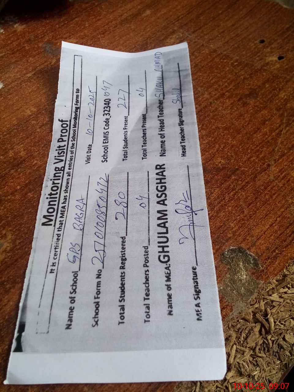 | Attendance Register | Head Teacher | MEA with School | Visit Proof |