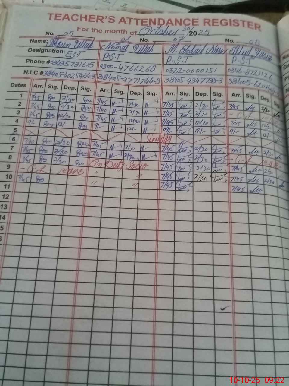 | CNIC | Full Name | Designation | R/C | Absence during last cal. month |