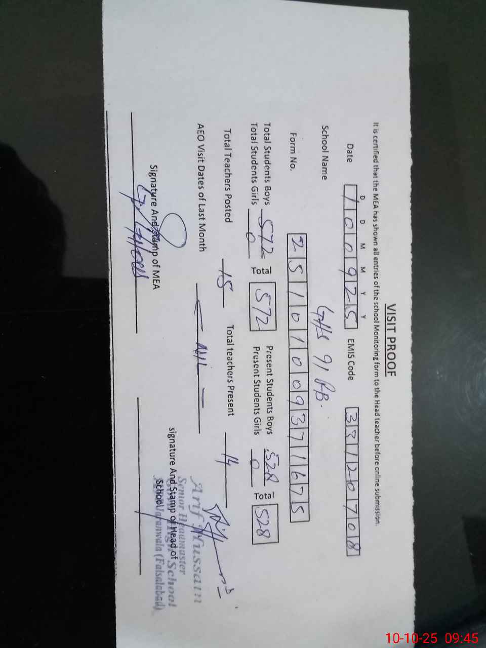 | Attendance Register | Head Teacher | MEA with School | Visit Proof |