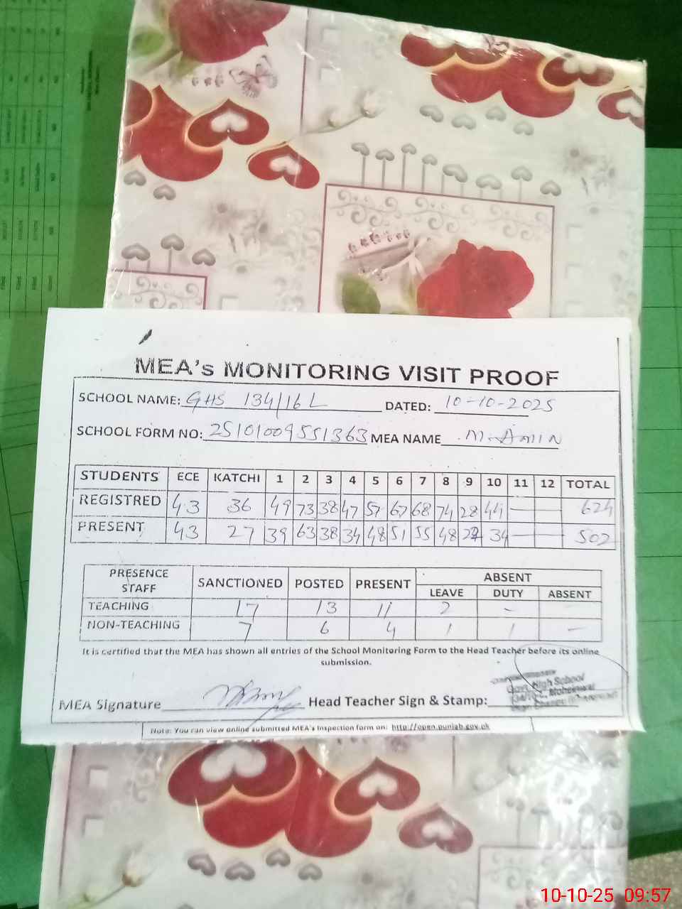 | Attendance Register | Head Teacher | MEA with School | Visit Proof |