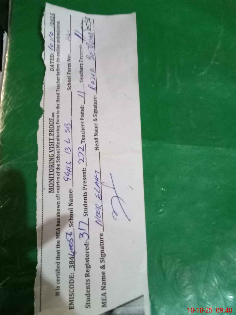 | Certified that this School was Inspected by the Undersigned MEA/DMO Today and the Information Stated Above is as Per Record. | |||||