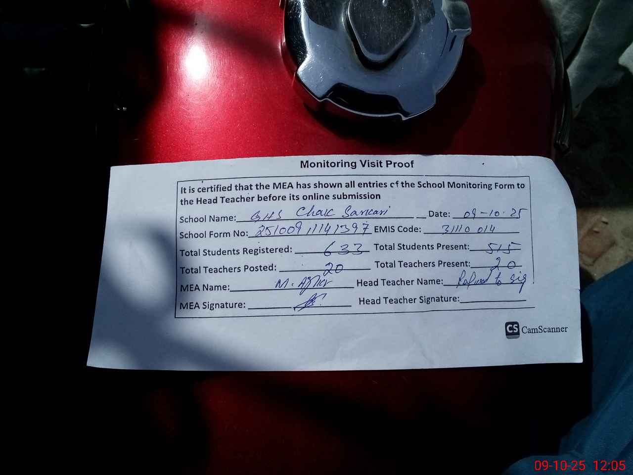 | Attendance Register | Head Teacher | MEA with School | Visit Proof |