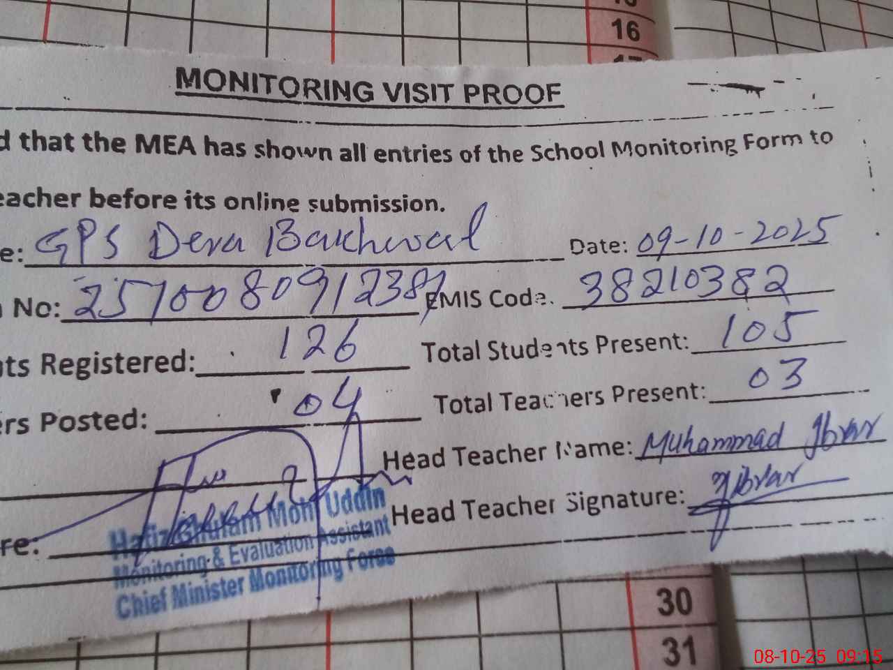 | Attendance Register | Head Teacher | MEA with School | Visit Proof |