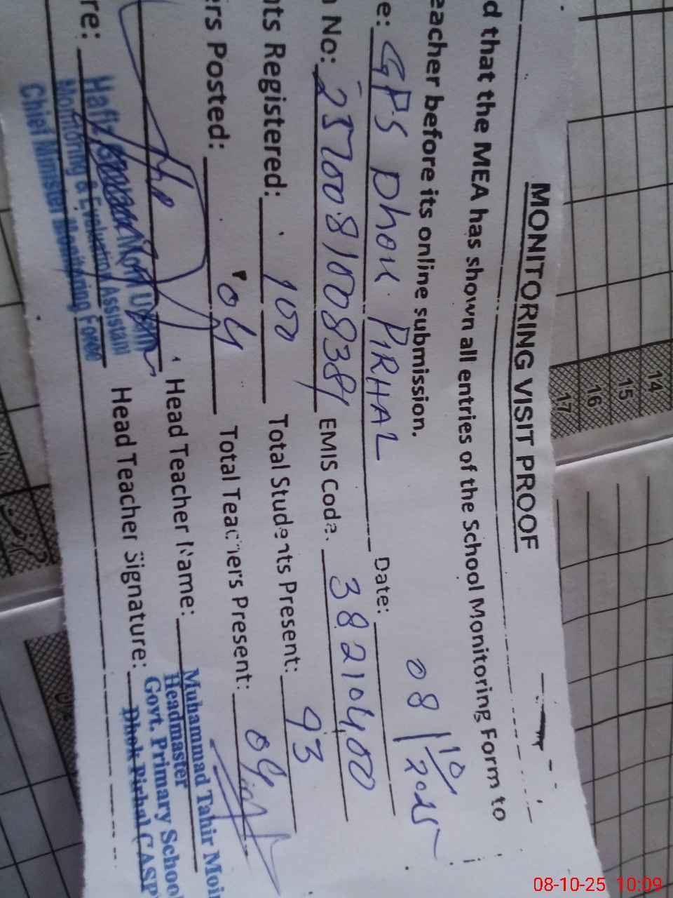 | Attendance Register | Head Teacher | MEA with School | Visit Proof |