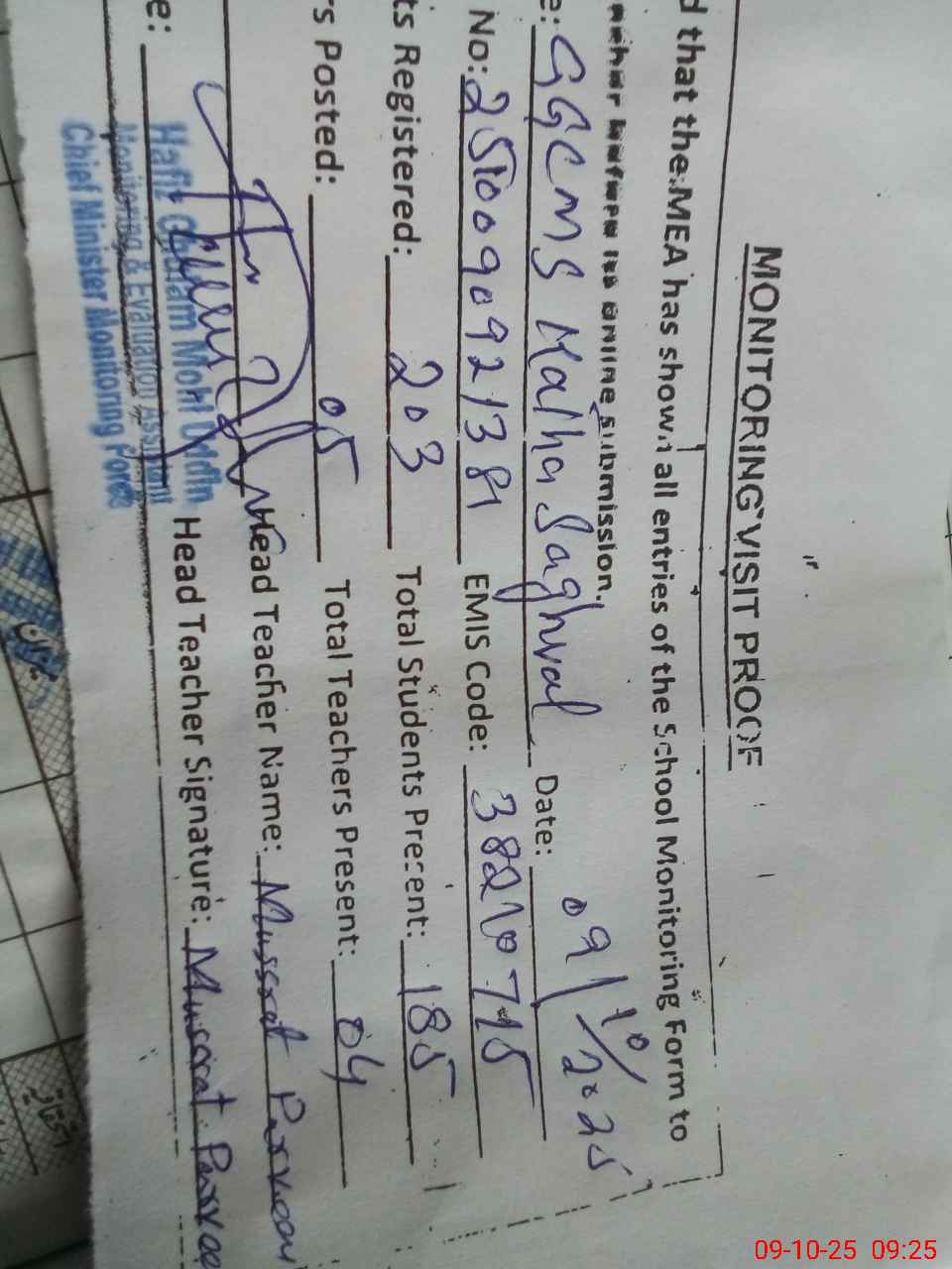 | Monitoring Date: 09-10-2025 | Start Time: 09-10-2025 08:52 AM | End Time: 09-10-2025 09:34 AM | Name of MEA: HA**** GH**** MO**** UDDI**** | |