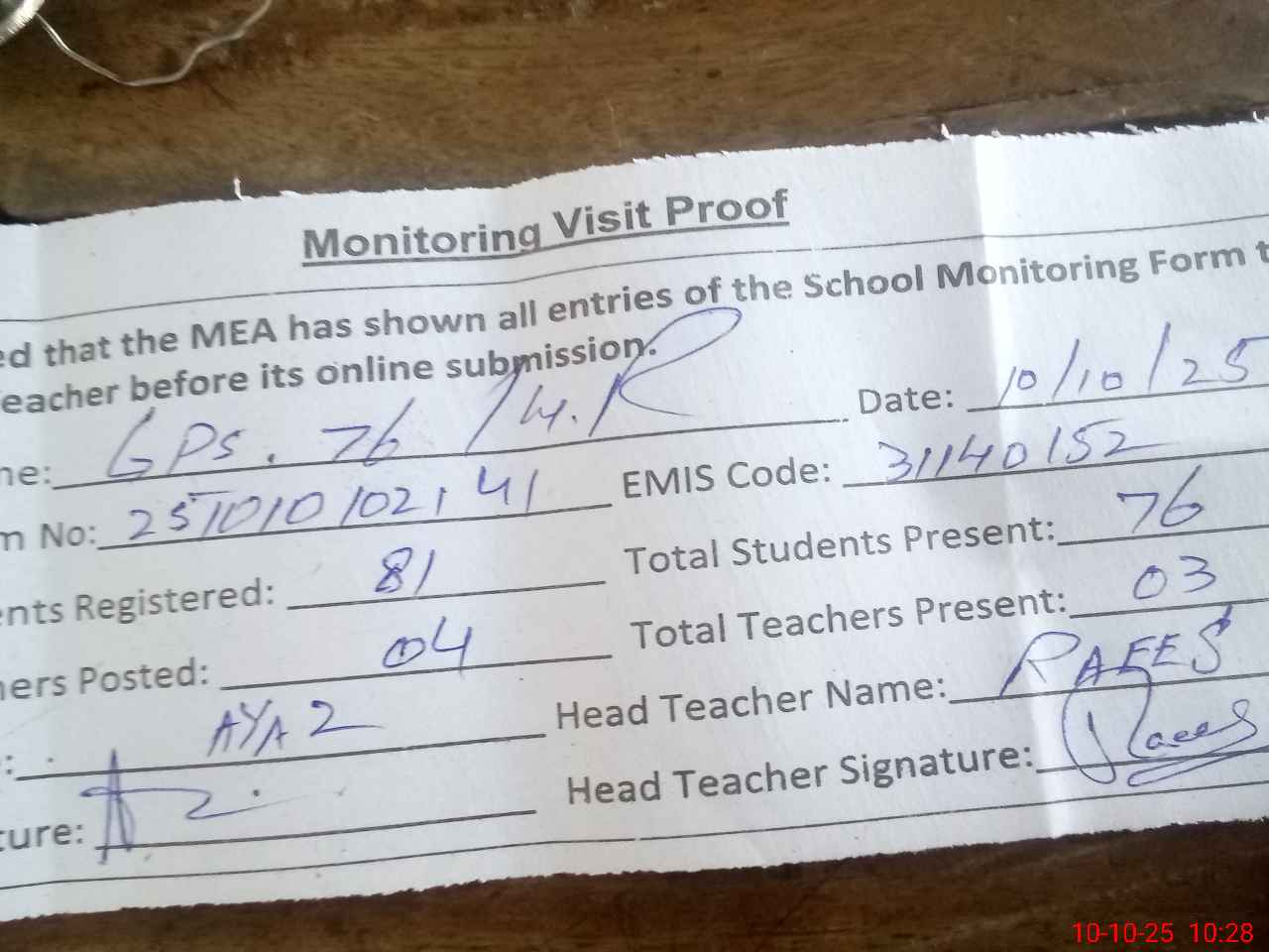 | Monitoring Date: 10-10-2025 | Start Time: 10-10-2025 10:00 AM | End Time: 10-10-2025 10:31 AM | Name of MEA: Ay**** Me**** BN**** 13 | |
