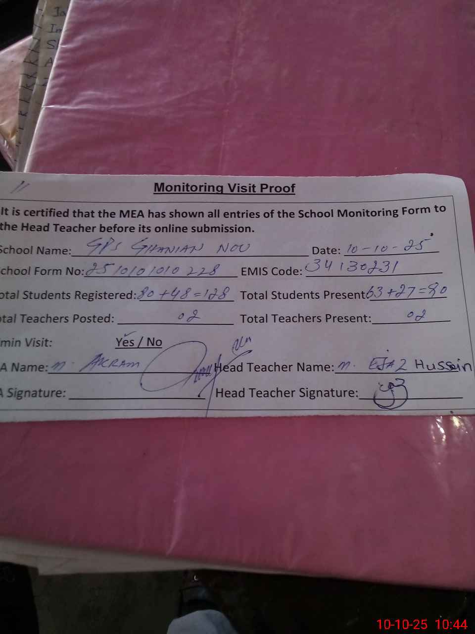 | Attendance Register | Head Teacher | MEA with School | Visit Proof |