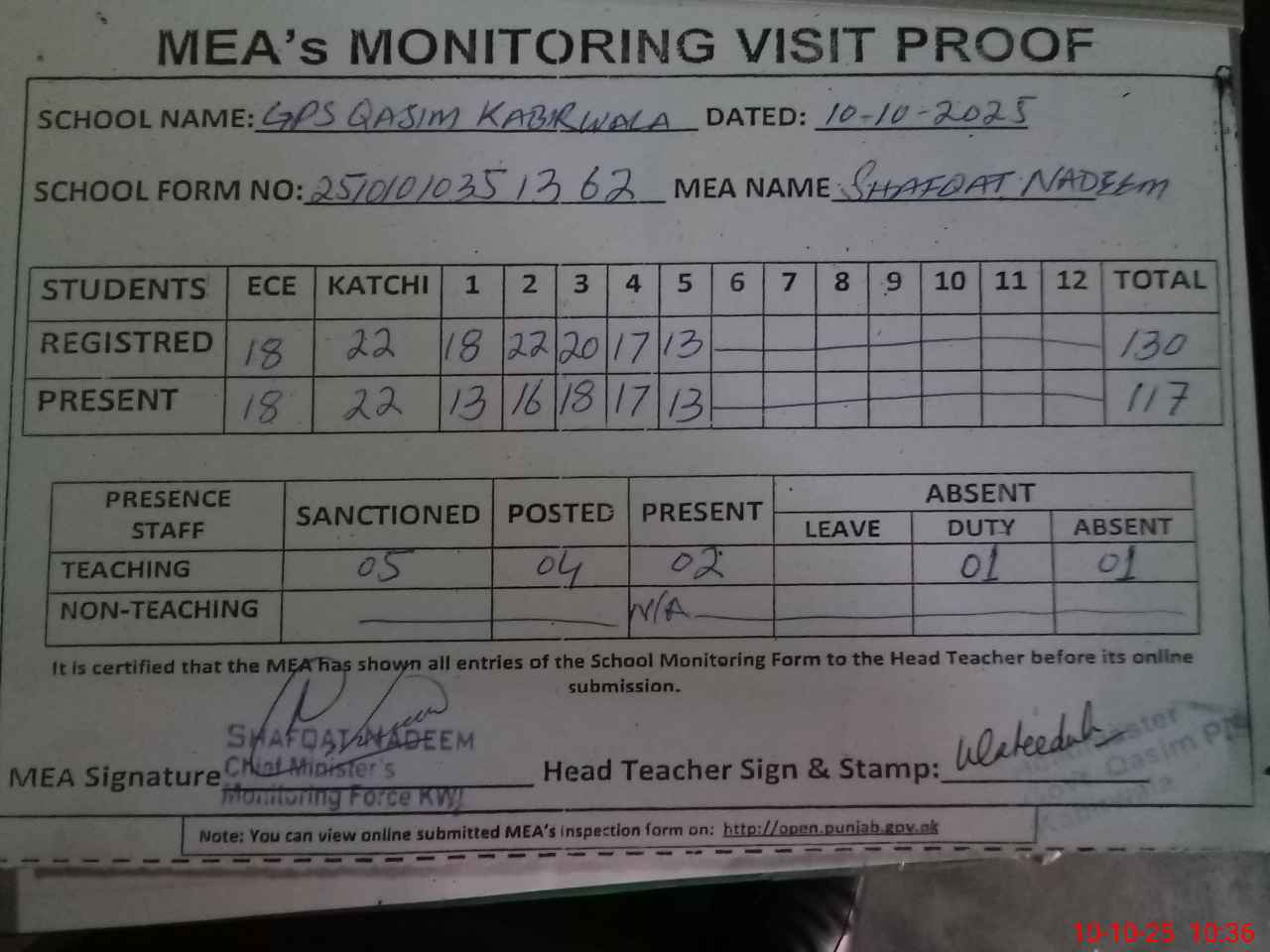 | Attendance Register | Head Teacher | MEA with School | Visit Proof |