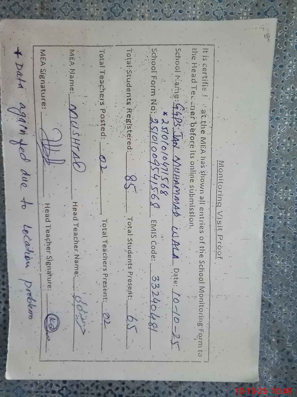 | Certified that this School was Inspected by the Undersigned MEA/DMO Today and the Information Stated Above is as Per Record. | |||||