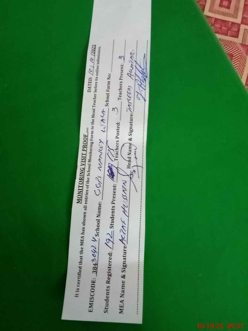 | Certified that this School was Inspected by the Undersigned MEA/DMO Today and the Information Stated Above is as Per Record. | |||||