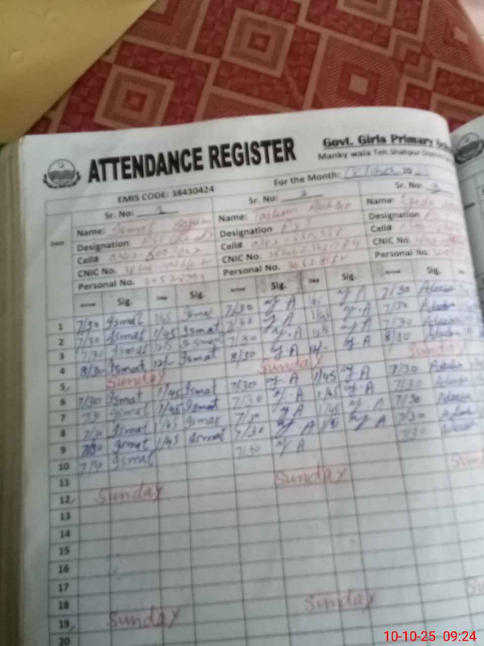 | CNIC | Full Name | Designation | R/C | Absence during last cal. month |