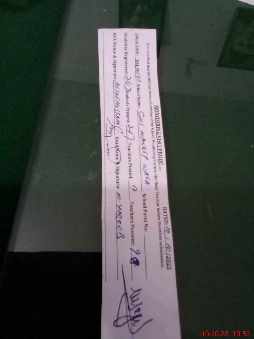 | Certified that this School was Inspected by the Undersigned MEA/DMO Today and the Information Stated Above is as Per Record. | |||||