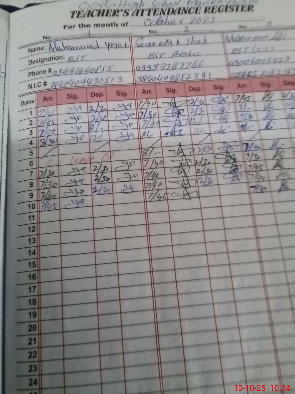 | CNIC | Full Name | Designation | R/C | Absence during last cal. month |
