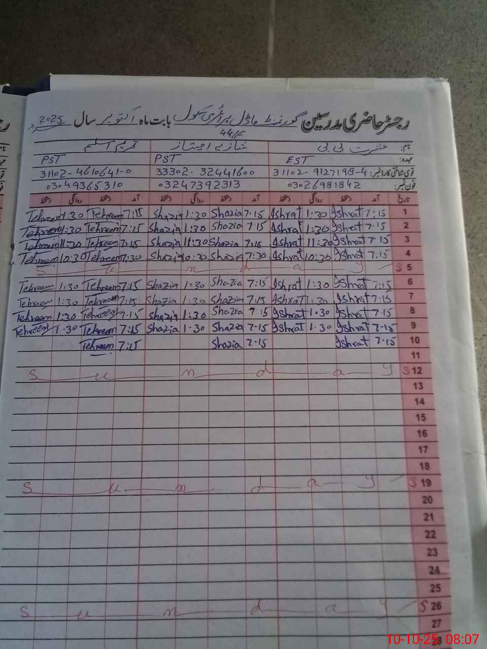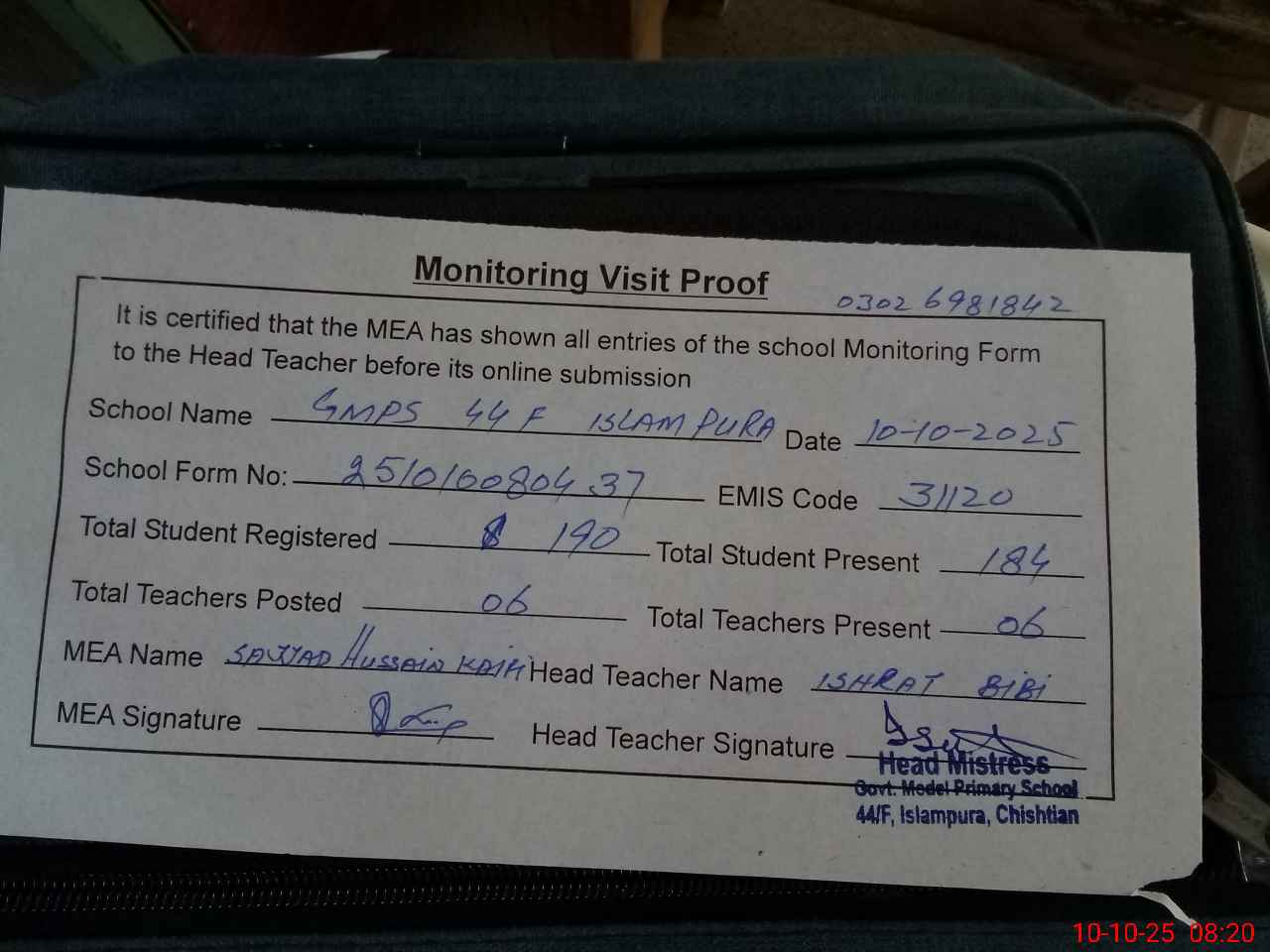 | Name: IS**** BB Designation: (School Headmaster's/Headmistress's) EST Phone/Cell Number: 03**** |