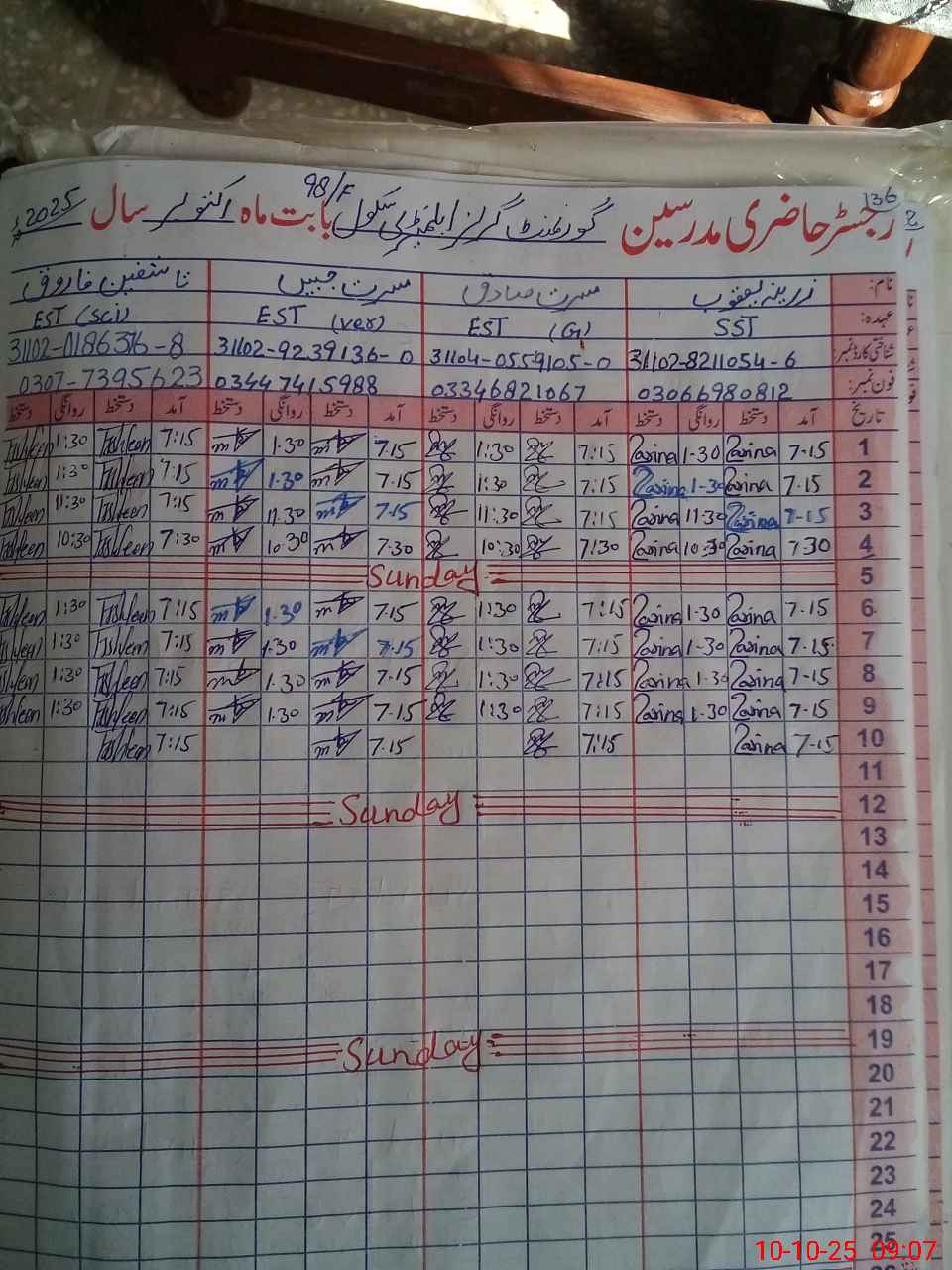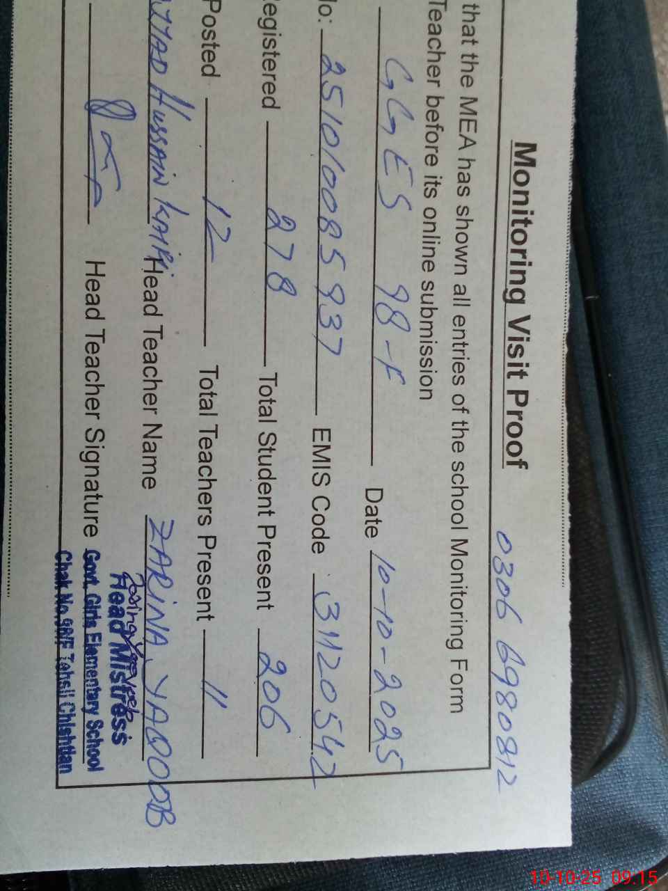 | Name: ZA**** YA**** Designation: (School Headmaster's/Headmistress's) SST Phone/Cell Number: 03**** |