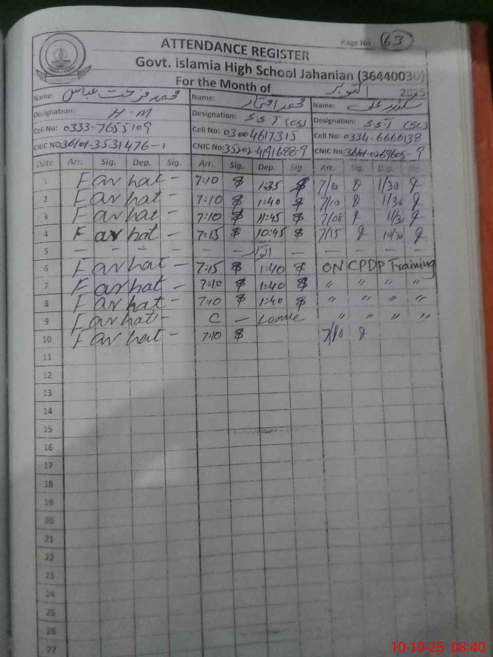 | CNIC | Full Name | Designation | R/C | Absence during last cal. month |