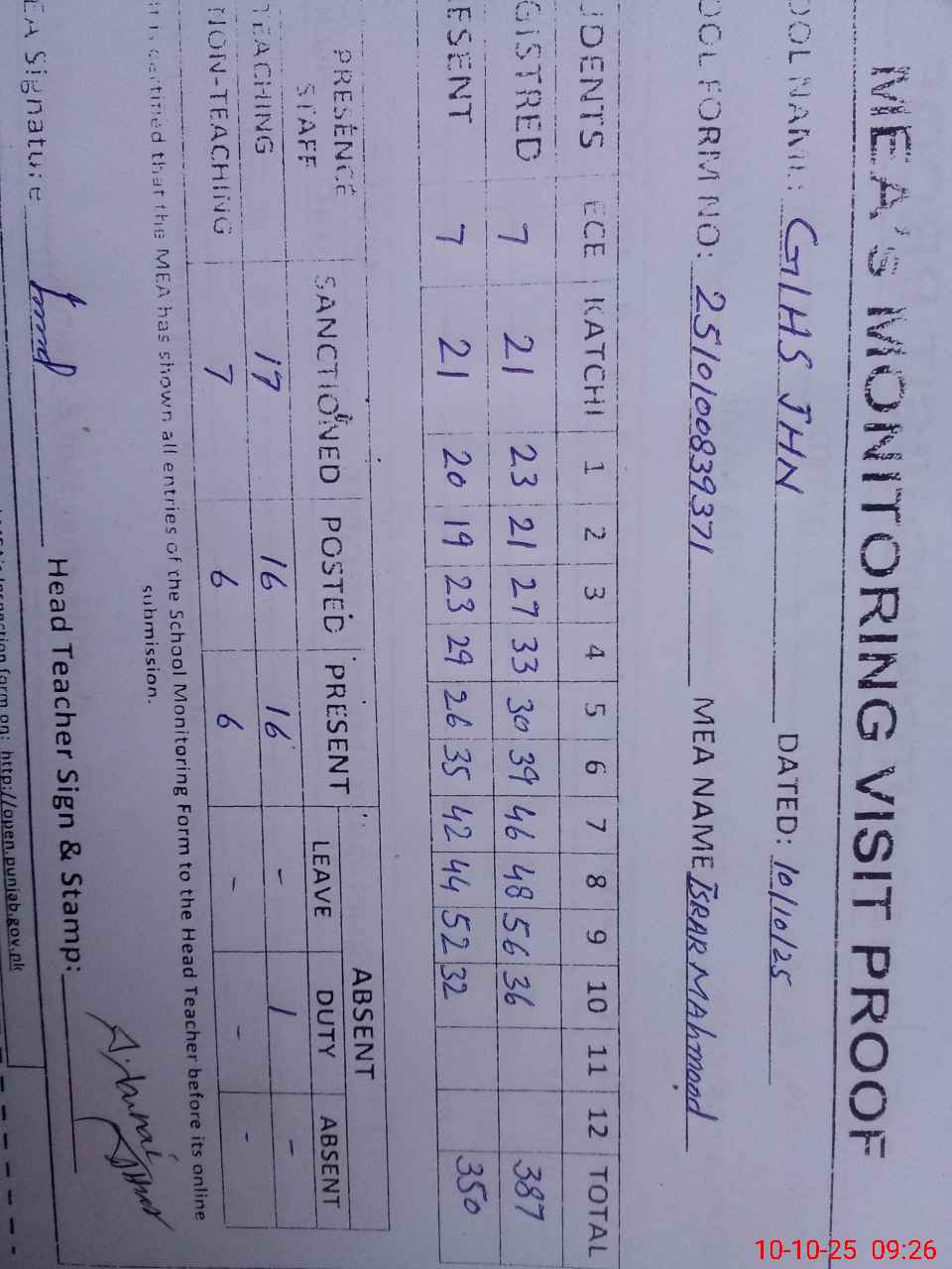 | Attendance Register | Head Teacher | MEA with School | Visit Proof |