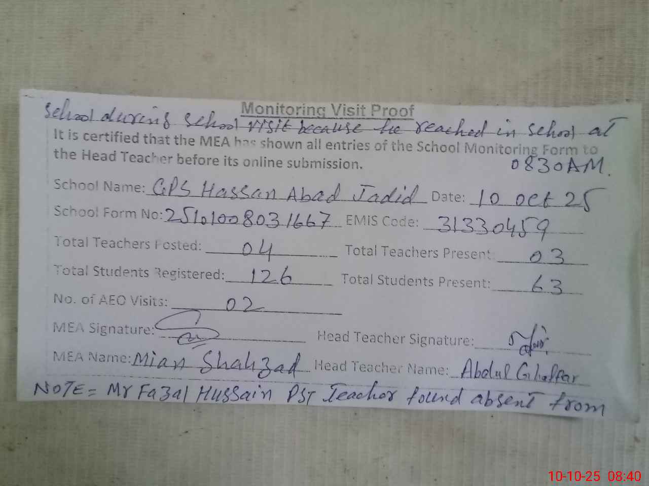 | Remarks (Use Separate Page if Required): Mr Fazal Hussain PST teacher found absent from school during school visit because he reached in school at 0830 AM | |||||
