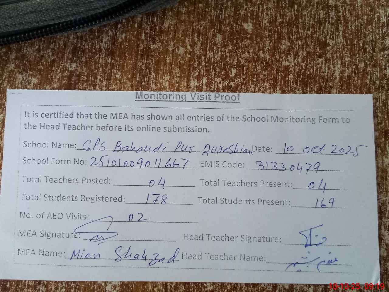 | Monitoring Date: 10-10-2025 | Start Time: 10-10-2025 08:50 AM | End Time: 10-10-2025 09:21 AM | Name of MEA: Sh**** Ah**** | |
