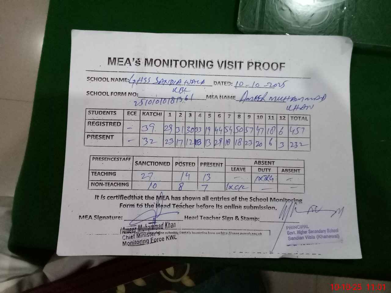 | Attendance Register | Head Teacher | MEA with School | Visit Proof |