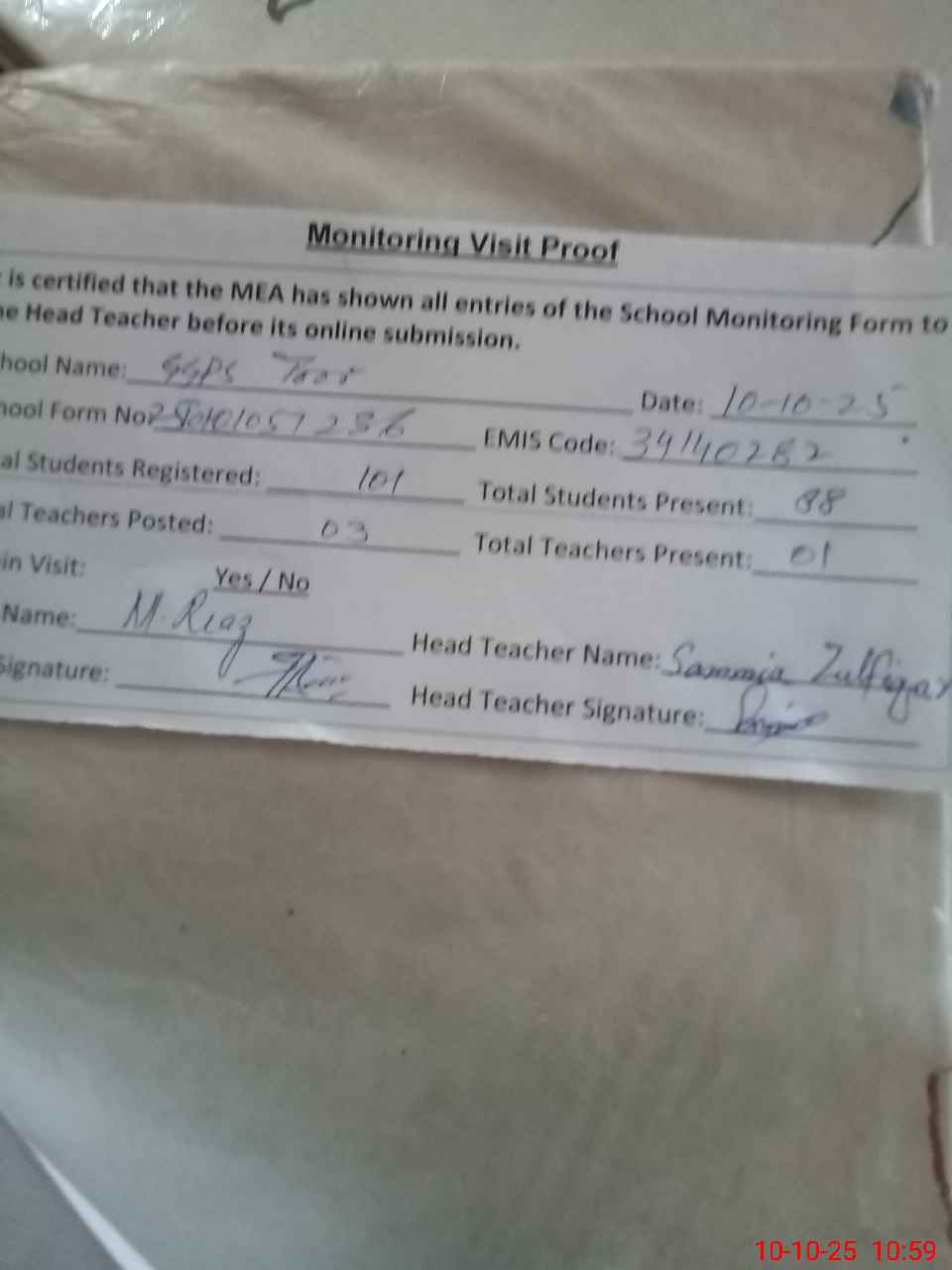 | Certified that this School was Inspected by the Undersigned MEA/DMO Today and the Information Stated Above is as Per Record. | |||||