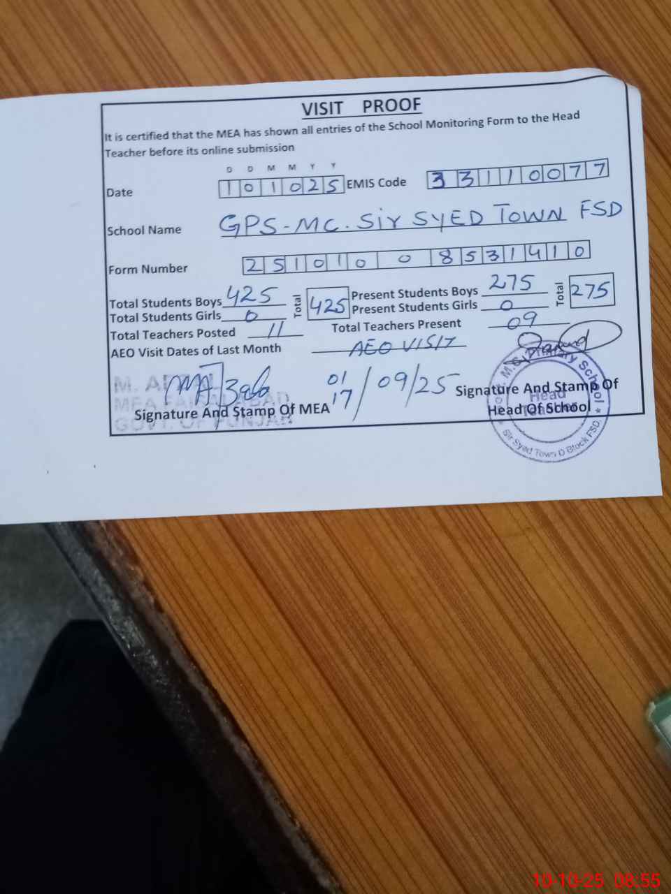 | Certified that this School was Inspected by the Undersigned MEA/DMO Today and the Information Stated Above is as Per Record. | |||||
