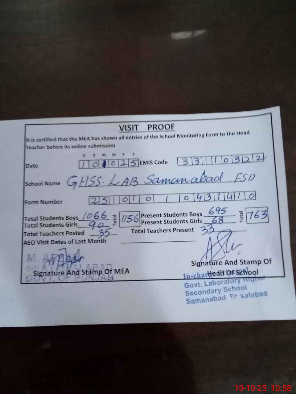 | EMIS Code: 33110322 | Name of School: GHSS LAB SAMANABAD (ATTACH WITH GCET) | |||
