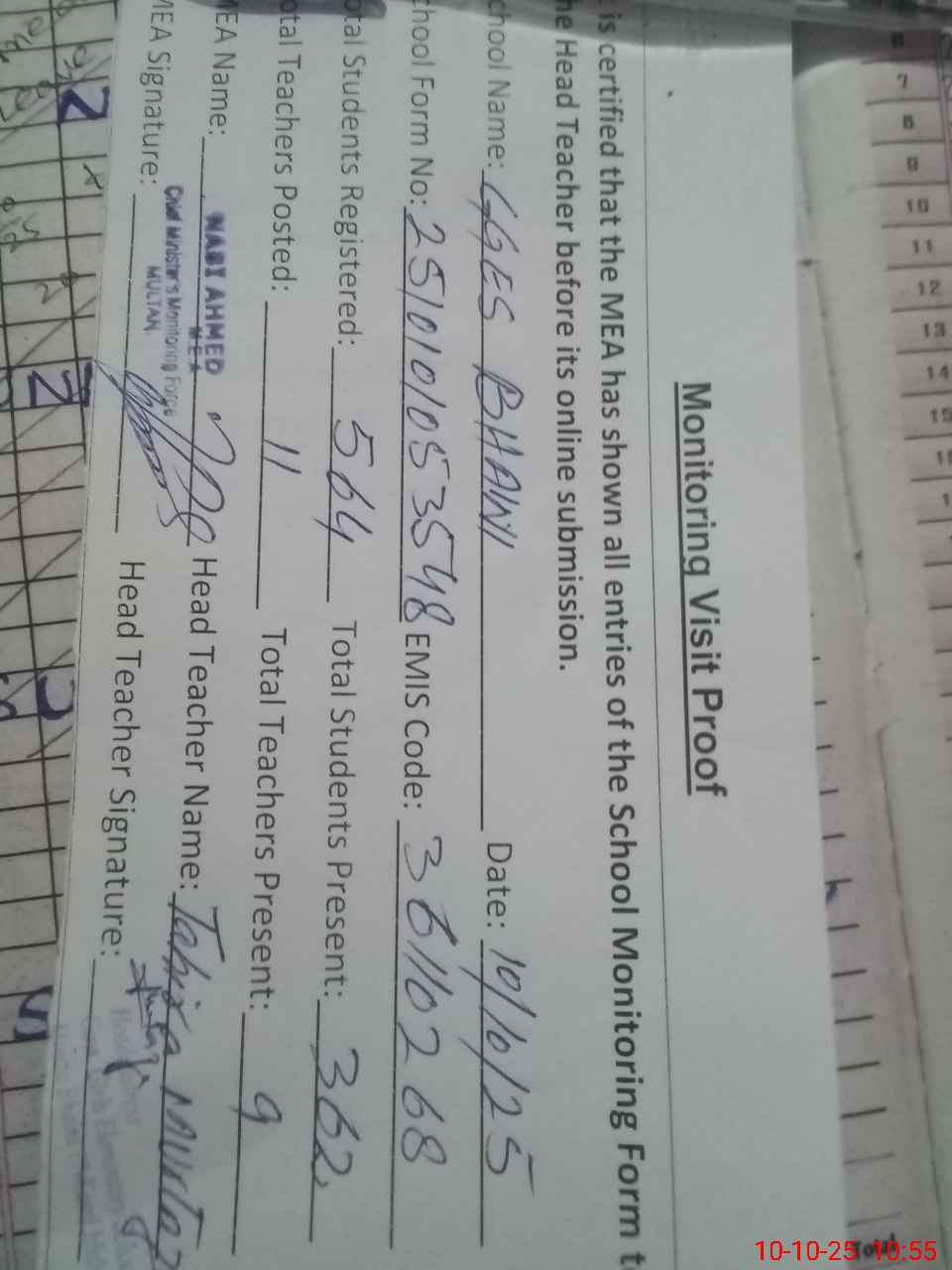 | EMIS Code: 36110268 | Name of School: GGES BHAINI BHUDLA ROAD MULTAN | |||