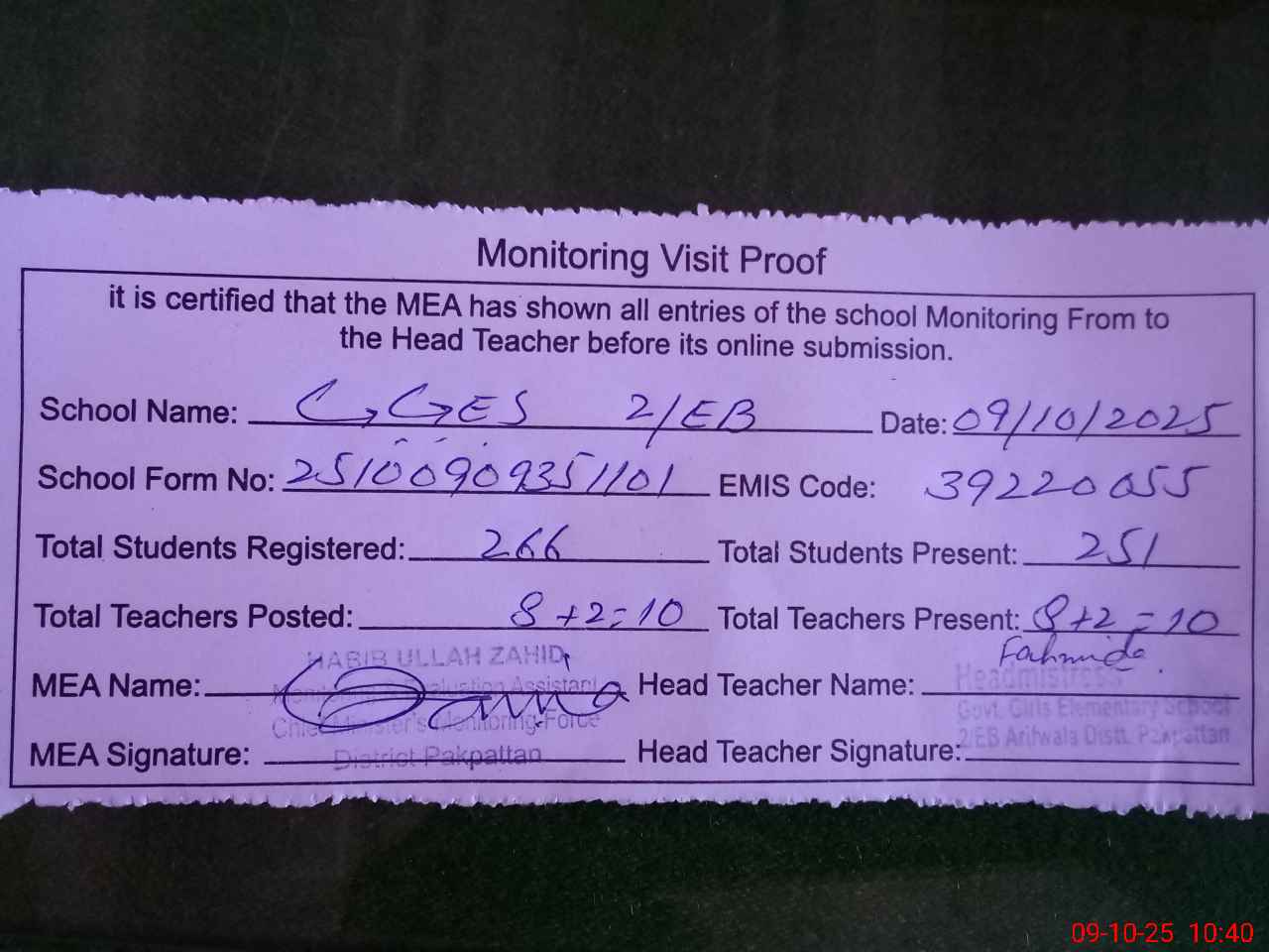 | Monitoring Date: 09-10-2025 | Start Time: 09-10-2025 09:42 AM | End Time: 09-10-2025 10:46 AM | Name of MEA: Ha**** Ul**** Ur**** Ba**** Al**** | |