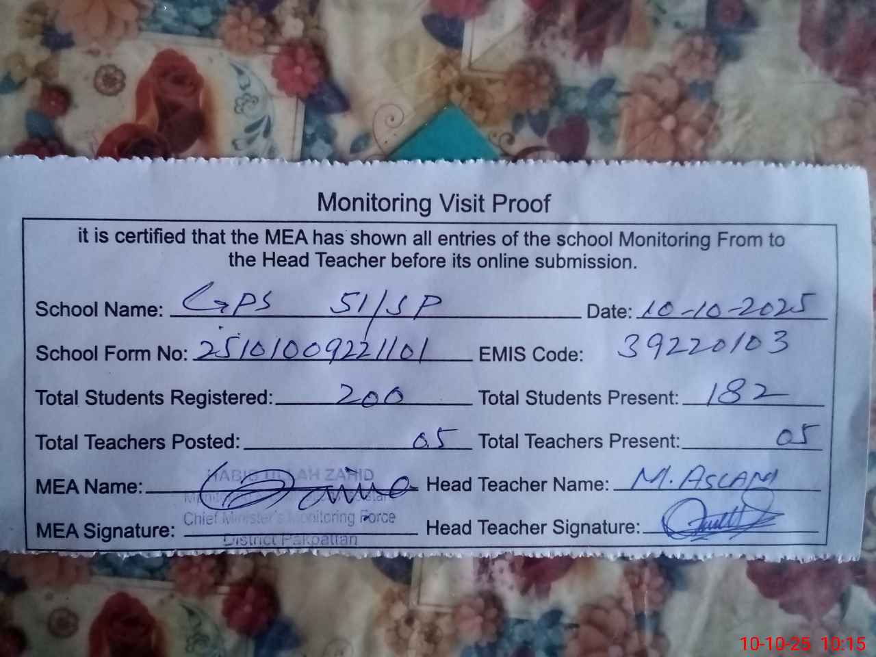 | Certified that this School was Inspected by the Undersigned MEA/DMO Today and the Information Stated Above is as Per Record. | |||||