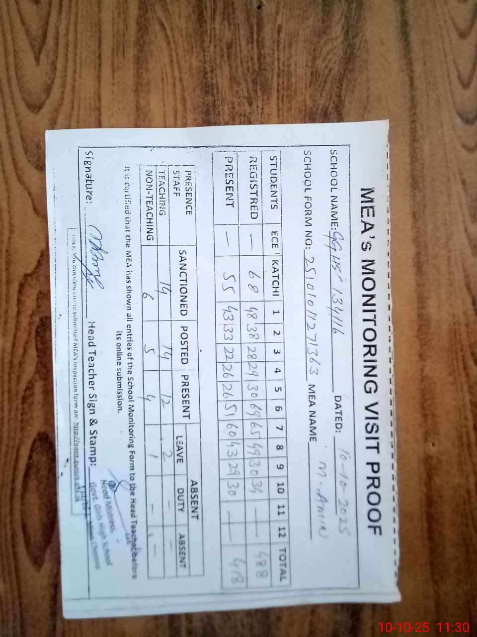 | Attendance Register | Head Teacher | MEA with School | Visit Proof |