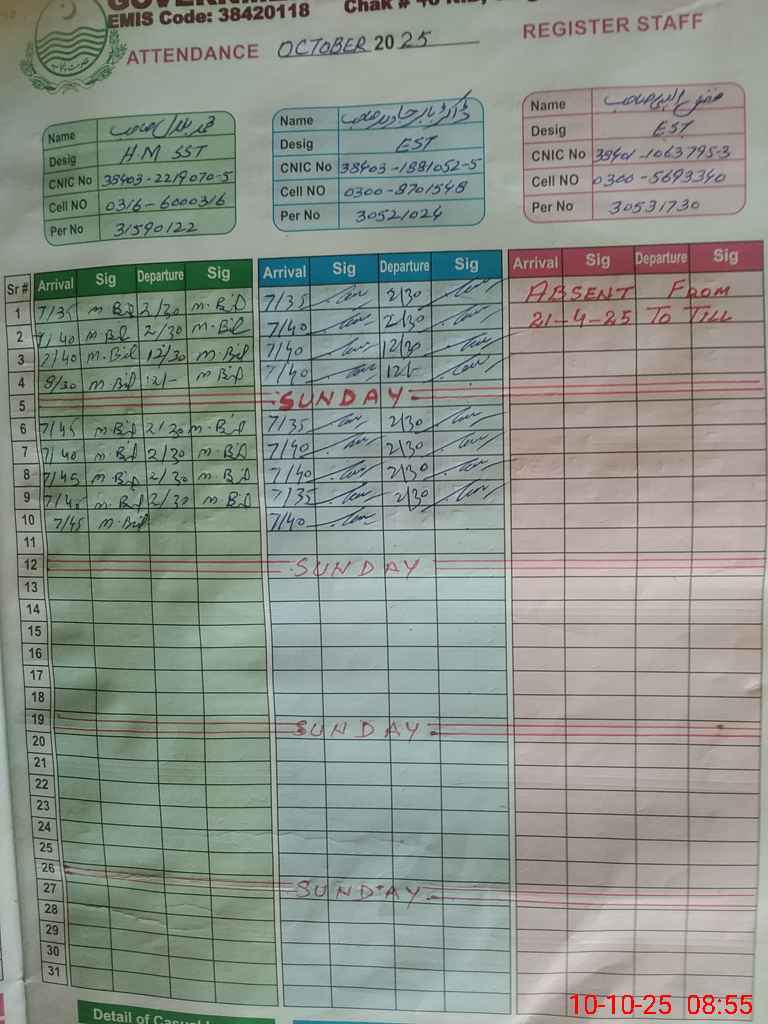 | CNIC | Full Name | Designation | R/C | Absence During Last Calender Month |