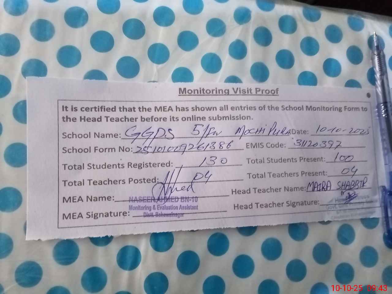 | EMIS Code: 31120397 | Name of School: GGPS CHAK 5/FW MOCHI PURA | |||